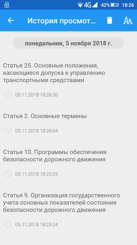 - История просмотров: приложение хранит историю просмотра статей, формируя список и сортирую историю по дате просмотра