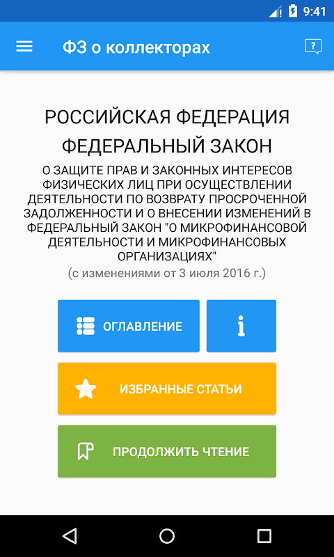 Приложение представляет собой удобный справочник по Федеральному закону РФ «О защите прав и законных интересов физических лиц при осуществлении деятельности по возврату просроченной задолженности и о внесении изменений в Федеральный закон «О микрофинансовой деятельности и микрофинансовых организациях» или же проще - закон о коллекторах. Приложение содержит полный текст закона, актуальный на данный момент времени (с изменениями от 03.07.2016).