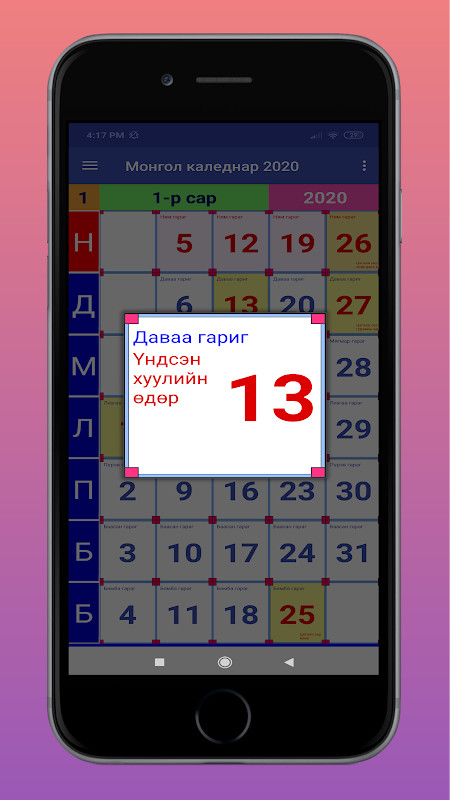 2020 оны хуанли: Энэхүү програм нь 2020 оны нийтийн амралт, баяр наадмыг багтаадаг. Та баяр наадам болон баяр ёслолоо төлөвлөхдөө энэ програмыг ашиглаж болно.