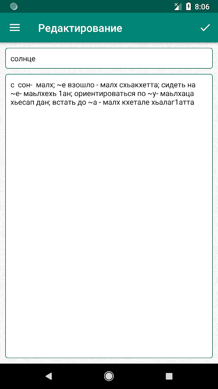 Чеченский словарь содержит более 33 тысяч слов на русском и около 21 тысяч слов на чеченском языке. Можно добавлять собственные слова и сообщать об этом разработчику, а также редактировать имеющиеся в базе слова.