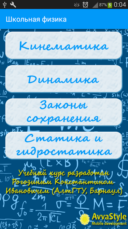 Приложение «Школьная физика – это просто» содержит уникальный учебный материал, разработанный в Алтайском государственном техническом университете им. И.И. Ползунова. Приложение позволит школьникам легко и качественно освоить такие разделы физики как кинематика, динамика, законы сохранения, статика и гидростатика. Скачивайте этот учебник и Вы поймете, что физика – это увлекательная наука, которую можно интересно изучать!