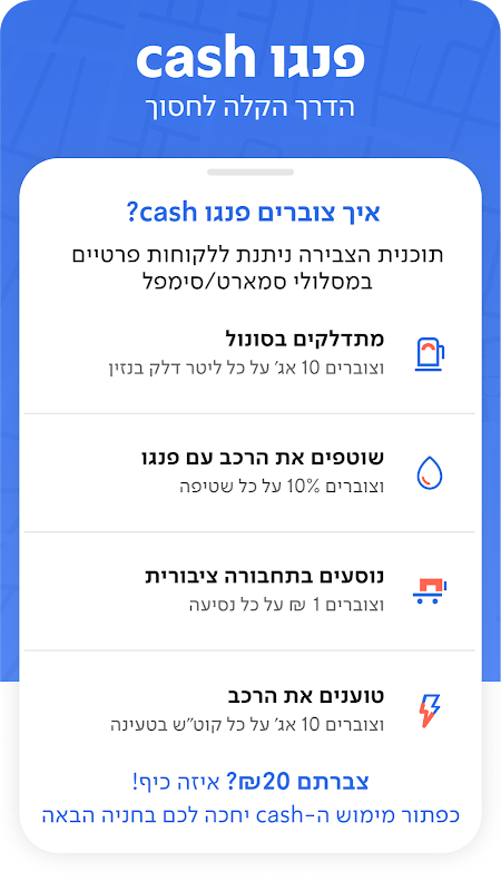 * Pango Cash — сбор наличных за парковочные места синего и белого цвета. 1 шекель за каждую поездку на общественном транспорте, 10 шекелей за каждый литр топлива на станциях Sonol, 10% от стоимости мойки.