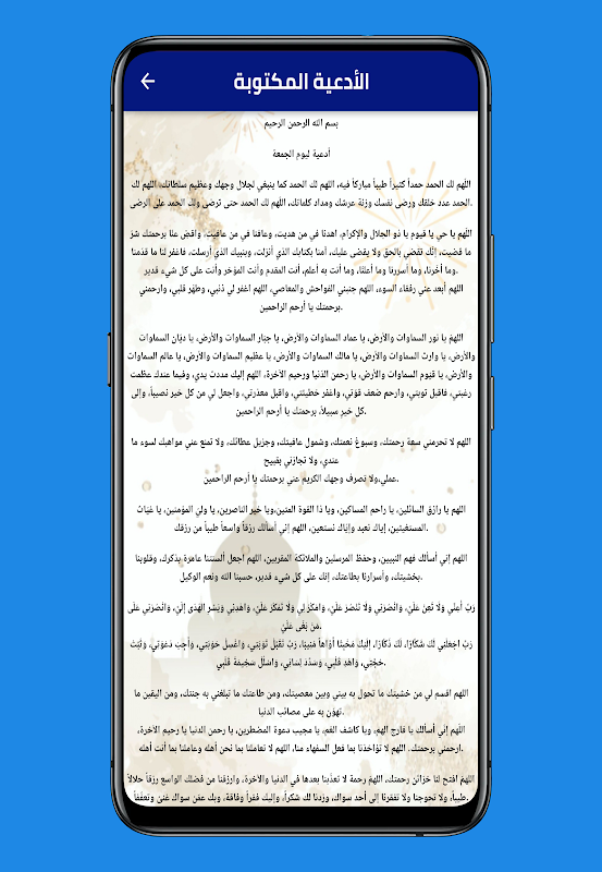 يحتوي هذا التطبيق على ادعية يوم الجمعة من القرآن الكريم والسنة النبوية مع خاصية التكرار والاستماع والتنقل وهو من أفضل التطبيقات الإسلامية في أجهزة الأندرويد