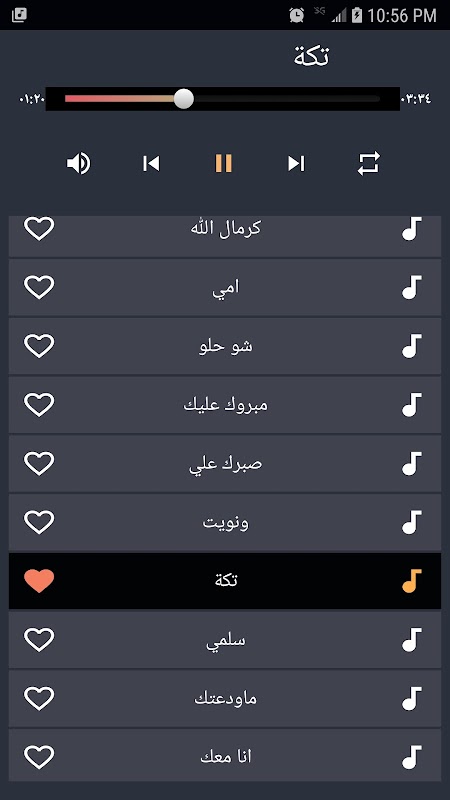 قائمة الأغاني الموجودة في التطبيق: