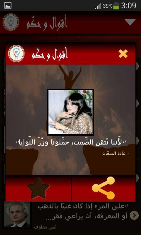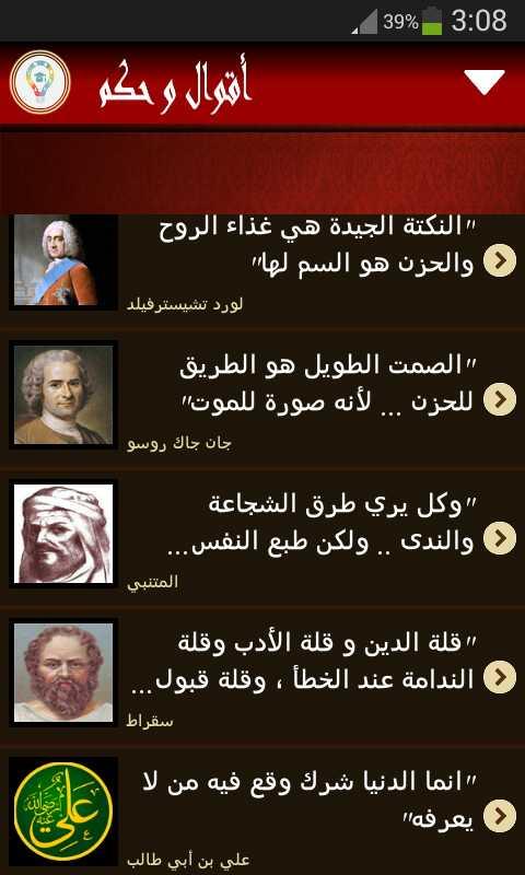 يحتوي هذا التطبيق على مئات اقوال و حكم لعظماء التاريخ كالامام علي بن ابي طالب و اينشتاين و غاندي و عمر بن الخطاب و صدام حسين و الحسن الثاني و المتنبي و غيرهم