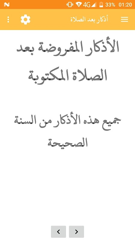 • يحتوي تطبيق الاذكار بعد الصلاة المفروضة على قائمة منسدلة تحوي هي الأخرى زرين أسفلين للتقدم بنسبة صغيرة في في الأبواب
