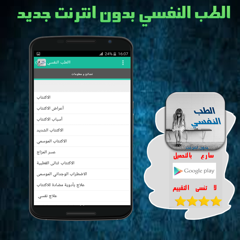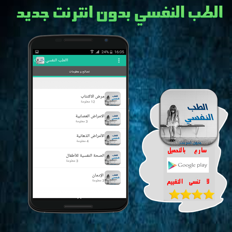 التطبيق يضم موسوعة كبيرة من الامرض النفسي حسب نوعها وخطورتها وكيفية العلاج منها او الوقاية منها مع صور توضيحية ومعلومات رائعة, التطبيق سهل الاستخدام ويمكن نشر وصفات العلاج ومشاركتها مع اصدقائك.