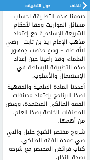 Прикладная предназначен них, чтобы рассчитать вопросы наследования в соответствии с положениями исламского права с принятием доктрины имама Зайд ибн Сабит, да будет Аллах доволен им это мнение большинства ученых, и принять во внимание при подготовке этого прикладной простоту в использовании и метода.