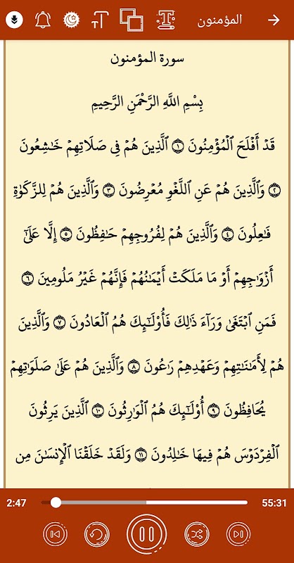 Нажав кнопку (Следующая сура) и (Предыдущая сура), вы можете прослушать предыдущие суры суры, которую вы слушаете, а также следующие суры.Программа также показывает вам продолжительность каждой суры, чтобы вы в курсе этого.