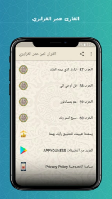 Коран - это семинар, разделенный на аудиоплату за заучивание и повторение голосом Омара аль-Казабри без сети.