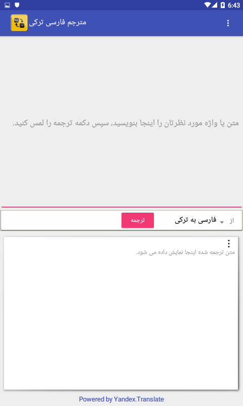 این برنامه مترجم به شما کمک می کند تا متن خود را از زبان فارسی به ترکی - ترکیه ای یا برعکس ترجمه کنید.