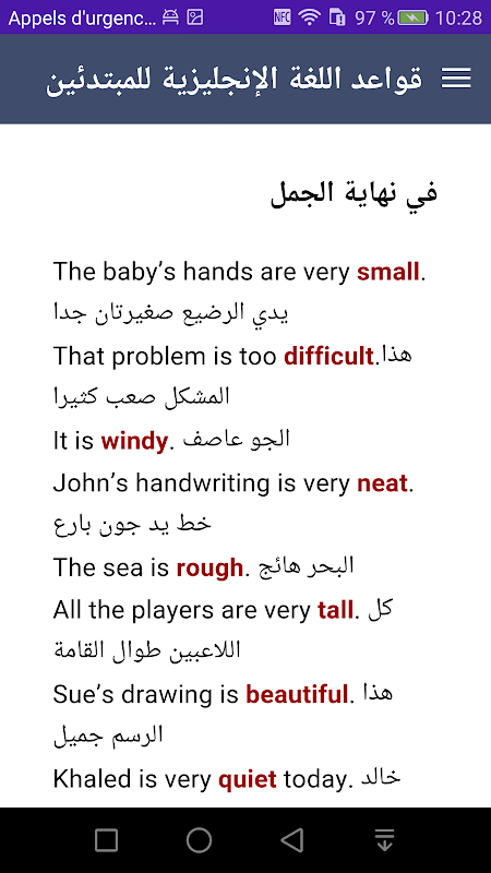 Изучают полный английский Грамматика для начинающих English Grammar для начинающих для Android является возможность освоить английский Grammer бесплатный арабский. Является упрощенным приложение ставит под рукой важный источник, Вы можете обратиться к нему и полагаться на него, чтобы узнать основные правила, где бы вы ни с нуля. Мы должны объяснить основные правила для начинающих в упрощенном порядке и подробно с примерами.