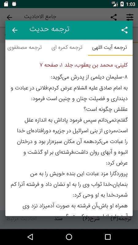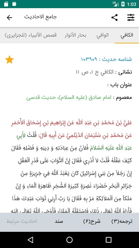 Программа «Комплексный хадис» - это мобильная версия базы данных «Комплексный хадис» (https://hadith.inoor.ir), которая предоставляет доступ к ресурсам шиитского хадиса для студентов, исследователей и тех, кто интересуется науками о хадисах и учениями Ахл аль-Байта. В этом программном обеспечении, помимо предложения сборника повествований, доступных в 199 наименованиях шиитских хадисных источников, включая около 400 000 повествований и переводов и написанных на них объяснений, также предоставляются связанные хадисы и повествовательные документы. Кроме того, были предоставлены средства исследования, такие как поиск в тексте хадисов, создание книжной полки, вставка указателя хадисов и т. Д. Вы можете использовать информацию, хранящуюся в автономном режиме, в разделах «Последние хадисы», «Избранное» и «Индексы» в автономном режиме после отключения от сети.