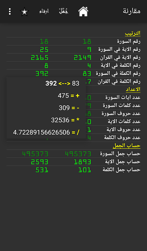 Статистика коранические стихи и слова (соответственно, числа и фразы счета)