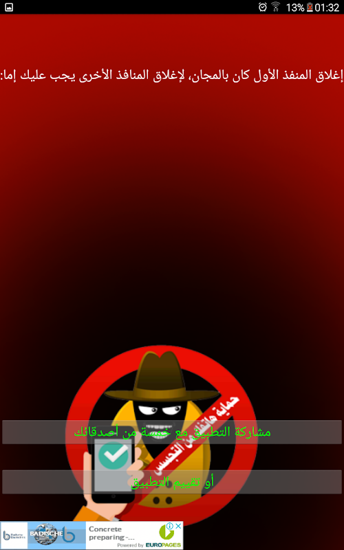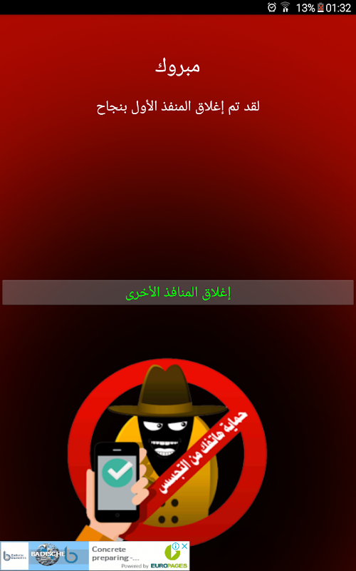 ا اريد ان اوصله لك من هذا التطبيق هو أن الحماية من التجسس على الهاتف وقاية و ليست علاج فمهما حملت من برامج حماية الهاتف من التجسس لن تغنيك شيئا فقط تذكرك بأمر مهم جدا ان هناك من يتربص بك و لايكره اختراق الواتس اب والتجسس على الفايسبوك و اختراق هاتفك.فخذ حذرك.