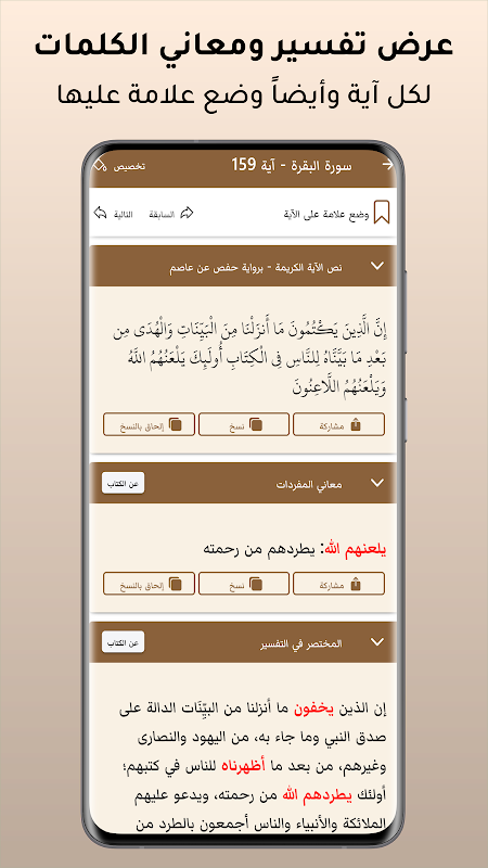- امكانية ارسال نص الآية أو تفسيرها عبر وسائل التواصل