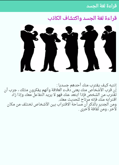 يحتوي التطبيق على عدة معلومات عن قراءة لغة الجسد