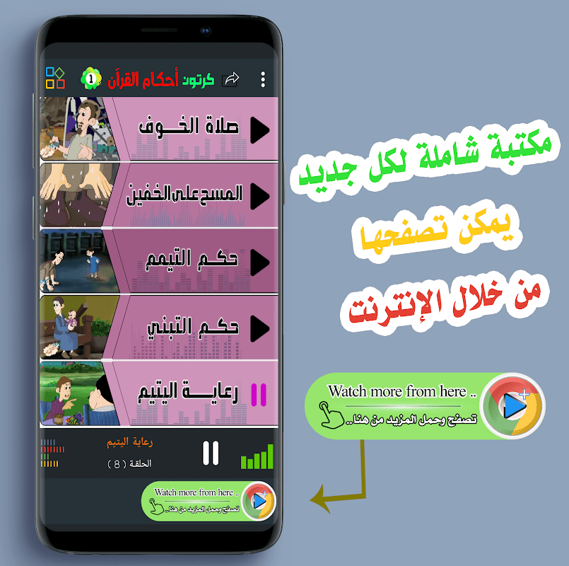 • Приложение отображает исламские эпизоды YouTube в мультипликационных сценах, полных красок и привлекательных звуков, что облегчает обучение детей и взрослых нормам морали и положениям Корана.