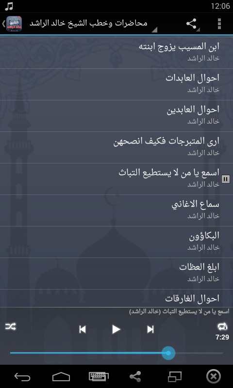 هذا البرنامج يمكنكم من الاستماع وتنزيل افضل خطب ومحاضرات الشيخ خالد الراشد بدون نت كامله, مع العديد من الامكانيات والخصائص الاخرى التي يتضمنها التطبيق, حيث يمكن من تحميل محاضره الشيخ خالد الراشد صوت بدون انترنت بصيغة mp3