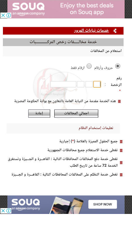 * الخدمة المقدمة عن طريق تطبيق مخالفاتك هي خدمة وسيطة لعرض قيمة مخالفاتك المرورية المعروضة على موقع الخدمة الإلكتروني المقدم من النيابة العامة بالتعاون مع بوابة الحكومة الإلكترونية