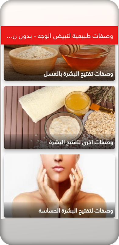 تطبيق وصفات طبيعية لتبيض الوجه يقدم لكم مجموعة من الوصفات الطبيعية لتبيض الوجه ويحتوي على التالي