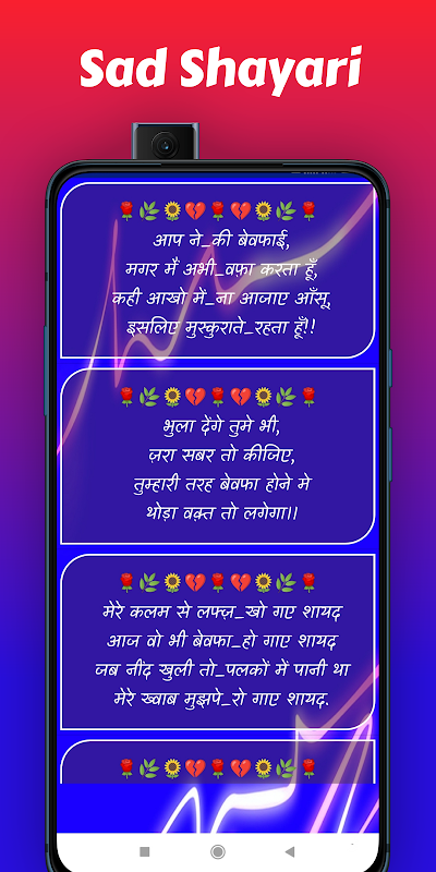Это приложение является подходящим местом для Specially Dard Bhari Shayari во всех категориях Best in class, таких как Bewafa Shayari, Sad Shayari, Dhoka Shayari, Mohabbat Shayari, Propose Shayari, Love Shayari, Romantic Shayari и т. д.