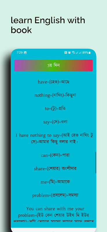 ভালো разговорный английский с бангла языком আমাদের এই ’ইংরেজি ভাষা শিক্ষা’ অ্যাপটিতে সকল দি কে সমান গুরুত্ব দিয়ে বাংলা থেকে ইংলিশ অনুবাদ, ইংলিশ থেকে বাংলা উচ্চারন, বাংলা ভাষায় ইংরেজি ইংলিশ থেকে বাংলা উচ্চারন েখা ও
