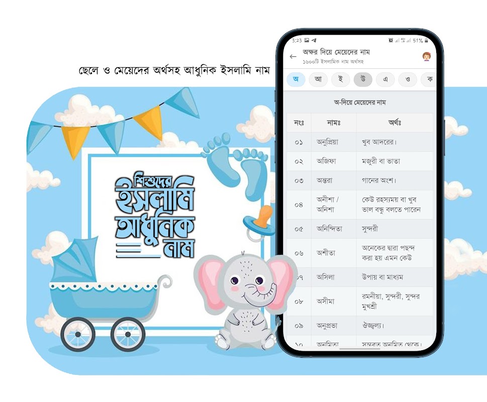 শিশুদের ইসলামিক ও সুন্দর নাম নিশ্চিত করতে মেয় ে ও ছেলেদের নাম রাখার বই আর কিনতে হবে না। আমাদের এই অ্যাপটি ছচ্ছে ইসলামিক নাম অর্থ সহ লে ও মেয়ে নামের অর্থ জানার app বাংলা। এখান থেকে ছেলে মেয়েদের ইসলামিক নাম অর্থসহ জা নতে পারবেন। এখানে ছেলেদের আরবি নাম অর্থ সহ থাকায় আপনি সহজেই ছেলেদের আধুনিক ইসলামিক নাম নির্বাচণ ে পারবেন। একই সাথে আরবি নাম সহ আরো থাকছে মেয়েদের আধুনিক নাম। নাম। নাম। নাম। এবং রয়েছে সকল স্বরবর্ণ ও ব্যঞ্জনবর্ণ দিয়ে শিশুদের নামের তালিকা যা অক্ষর নাম খুজে পেতে সহজ করবে।