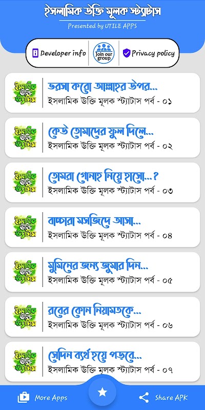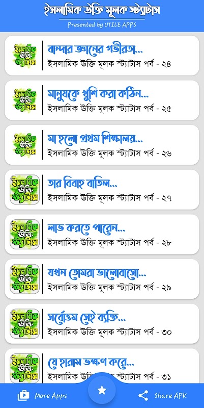 আমরা বিভিন্ন উলামায়ে কেরামগনের ইসলামি উপন্যাস সমগ্র থেকে অনেক বাণী জানতে পারি আমাদের ইসলামিক সাধারণ জ্ঞান কে আরো বারিয়ে দেয়। Исламская укти ইসলামিক উক্তি বা বিখ্যাত উক্তি অনেকেই প্রিয়জনদের পাঠিয়ে থাকে দাওয়াতি কাজে। অনেকেই বিভিন্ন социальные сети গুলোতে ইসলামিক স্ট্যাটাস পোস্ট করে থাকেন আবার কেও তো ইসলামিক স্ট্যাটাস ছবি সহ অথবা ইসলামিক উক্তি ছবি পোষ্ট থাকে। অনেকেই আবার বন্ধু-বান্ধবদের ইসলামিক এসএমএস সেন্ড করে। আমাদের এই исламское приложение এ থাকা পোষ্ট গুলো আপনি ইসলামিক এস এম এস বাংলা তে যে কাউকে এস এম এস পাঠাতে পারবেন। জুম্মার দিন গুলোতেও জুম্মা মোবারক স্ট্যাটাস পোস্ট করতে দেখা আমাদের исламские цитаты থেকে পছন্দের উক্তি আর исламский статус গুলো পোস্ট করতে পারবেন।