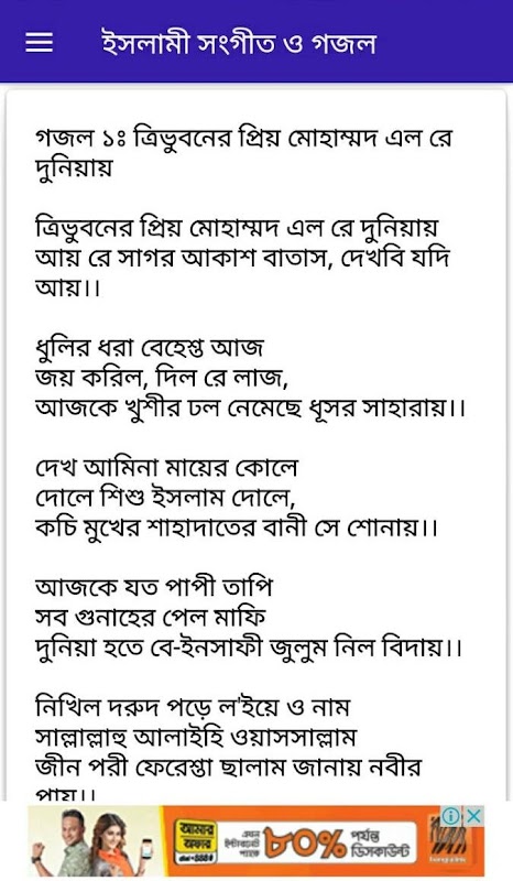 ইসলামী সংগীত ও গজলের গীতিমালা বিশাল সংগ্রহশালা নিয়ে আমরা এই এপসটি বানিয়েছি। এতে অনেক জনপ্রিয় ইসলামী সংগীত ও গজলের চরণ মালা। আশা করি আমাদের এই এপসটি আপনাদের ভাল লাগবে। আমাদের অ্যাপটিকে ৫ * স্টার রেটিং দিয়ে অনুপ্রেরনা দিবেন এমনই আশা আপনাদের কাছে। ধন্যবাদ সবাইকে আমাদের সাথে থাকার জন্য।