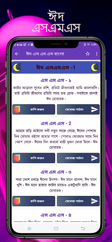 ঈদের এসএমএস এই অ্যাপটির মাধ্যমে আপনি আপনার পছন্দ মতো সকল এসএমএস গুলো খুব সহজে সবার সাথে শেয়ার করতে পারবেন ।