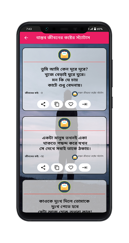 বাংলা কষ্টের স্ট্যাটাস অ্যাপটিতে রয়েছে বেশ কিছু বাস্তব জীবনের কষ্টের স্ট্যাটাস ও সএমএস, আশাকরি আপনাদের খুব ভালো লাগবে অ্যাপসটি। কষ্টের স্ট্যাটাস Bangla грустный статус থেকে যে কাউকে স্ট্যাটাস পা ঠাতে পারবেন।