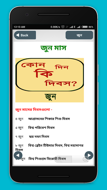 কোনদিন কি দিবস ~ Special Days ~ Kon Din Ki Dibosh এই সাধারণ জ্ঞান sadharon gyan বিষয়ক অ্যাপ bcs বিসিএস প্রস্তুতি, চাকরির ইন্টারভিউ বা বিভিন্ন জায়গায় চাকরির পড়াশোনা, বিশ্ববিদ্যালয় ভর্তি, ব্যাংক জব ও অন্যান্য পরীক্ষা ভাল করতে জানা অজানা সাধারণ জ্ঞান sadaron gan বা General Knowledge এর পরিধিকে সমৃদ্ধ করতে ভাল কাজে দিবে। এই কোন দিন কি দিবস - Kon Din Ki Dibosh অ্যাপ সংগ্রহে থাকলে পকেট ক্যালেন্ডার এর মত সহজে কোন দিন কি দিবস-Special Days জানাবে এবং সহজেই সবাইকে দিবস dibos অনুযায়ী বাংলা এসএমএস বা মেসেজ sms দিয়ে শুভেচ্ছা বিনিময় করতে পারবেন। আশা করি এই ফ্রি বাংলা অ্যাপটি আপনাদের ভাল লাগবে ও কাজে আসবে। ধন্যবাদ।