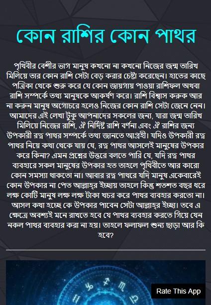 পৃথিবীর বেশীর ভাগ মানুষ কখনো না কখনো নিজের জন্ম তারিখ মিলিয়ে তার কোন রাশি সেটা বেড় করার চেষ্টা করেছেন। হাতের কাছে পত্রিকা থেকে শুরু করে যে কোন জায়গায় পাওয়া রাশিফল অথবা রাশি সম্পর্কে তথ্য মানুষকে আকর্ষণ করে। রাশি বিশ্বাস করুক আর না করুন মানুষ অগোচরে হলেও নিজের কোন রাশি সেটা জেনে নেন। আমাদের এই লেখা টুকু আপনাদের সকলের জন্য, যারা জন্ম তারিখ মিলিয়ে নিজের রাশি, ঐ নির্দিষ্ট রাশি বর্ণনা এবং ঐ রাশির জন্য উপকারী রত্ন পাথর সম্পর্কে তথ্য জানতে আগ্রহী। যদিও উপকারী রত্ন পাথর নিয়ে কথা থেকে যায় যে, রত্ন পাথর আসলেই মানুষের উপকার করে কিনা? এমন প্রশ্নের উত্তরে বলতে পারি যে, যদি রত্ন পাথর ব্যবহারে সকল মানুষের উপকার হত তাহলে পৃথিবীতে আর কারো কোন সমস্যা থাকতো না। আবার রত্ন পাথরে যদি মানুষ একেবারেই কোন উপকার না পেত আল্লাহ্র ইচ্ছায় তাহলে কিন্তু শতশত বছর ধরে লক্ষ কোটি মানুষ লক্ষ লক্ষ টাকা খচর করে পাথর ব্যবহার করতো না। আসল কথা হচ্ছে কে উপকার পাবেন সেটা আল্লাহ্র ইচ্ছা। তবে এ ক্ষেত্রে অবশ্যই মনে রাখতে হবে যে পাথর ব্যবহার করতে গিয়ে যেন নকল পাথর ব্যবহার করা না হয়। তাহলে ফলাফল শুন্য ছাড়া আর কি হবে?