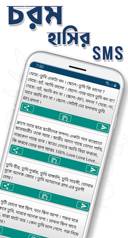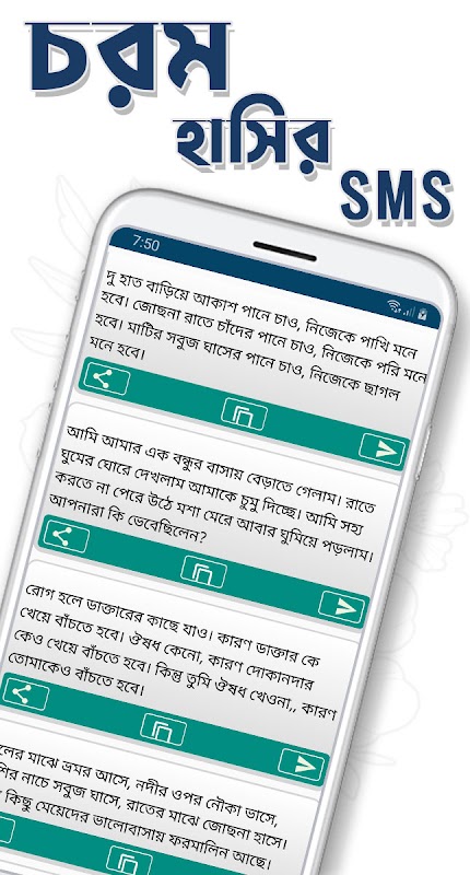 আশা করি ভালো লাগবে আপনাদের মেয়েদের হাসানোর এসএমএস স্ট্যাটাস। তাই এই অ্যাপটি হাসির SMS দিয়ে সাজানো হয়েছে। SMS গুলো খুব সহজে পাঠাতে পারেন আপনার বন্ধুদের কাছে।