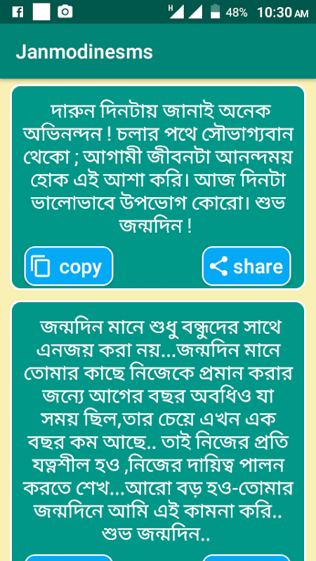 সবাই কে জানাই আন্তরিক অভিন্দন ও জন্মদিনের এসএমএস বন্দুদের পাঠানোর সুন্দর সুন্দর একটি অ্যাপ। এখানে আপনি পাবেন বাংলায় লিখিত চমৎকার সব মেসেজ। বন্দু এসএমএস টি আপনাদের সকল বন্দু / বান্দবদের মাঝে কপি বা শেয়ার করে পাঠাতে পারবেন। এখানে মঝার মঝার বাংল এসএমএস পড়তে পাড়বেন এবং আপনার প্রিয় কে কে পাঠাতে পারবেন। ম্যাসেজে থেকে মন খুলে প্রিয় মানুষের কাছে মেসেন্জারে, মেসেন্জারে, ফেসবুকে, ইমোতে এছাড়াও আরো অনেক। । আছে মনের মধ্যে গুরপাক খায় যা মুখে আসে সেই সব সব কথা এবসটি এবসটি।। এই বাংলা এসএমএস (জন্মদিন এসএমএস) Приложение টি আপনাদের কেমন লাগলো অবশ্যই জানাবেন। ধন্যবাদ!