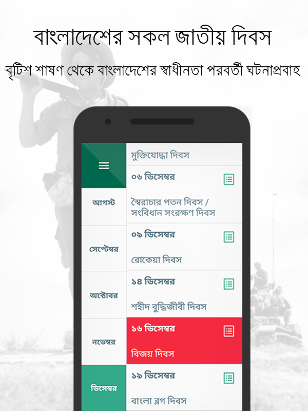 - Вы получите уведомление на каждый национальный день о дне, и это история. Вы или ваши друзья или семья может узнать подробности о каждом инциденте, который имел место в истории Бангладеш.