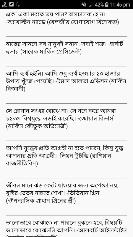 Bangla bani / bangla quotes/ bikkhatoukti/ bangla ukti / bangla quotation is a bangla apps which is a collection of inspirational quotes in bangla. In this bikkhato ukti bangla apps hundreds of “quotation in bangla”, quotes in bengali , bengali quotation, bengali quotes are included. There are lots of famous people out there. Their famous quotes bangla is accumulated in this “quotation in bengali” app. In bengali famous persons are called bikkhato or monishi. So this bangla app can be named as bikkhato ukti, monishider ukti, bangla ukti, bangla bani, banglay bani, banisomogro etc. The key persons included in this bangla quotes/ bangla quotation/ quotes in bengali/ quotation in bengali /bangla bani