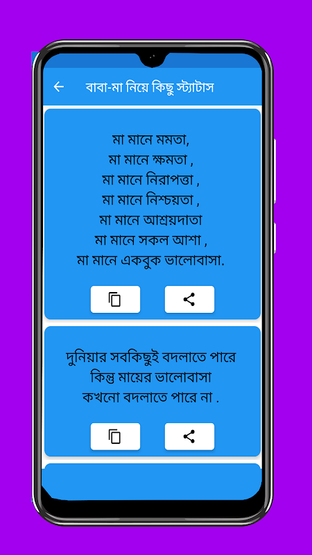 এই অ্যাপটির ভিতরে থাকা প্রত্যেক টি এসএমএস ও স্ট্যাটাস শেয়ার করা যাবে সকলের কাছে . আশা করি আমাদের এই অ্যাপটি ভালো লাগবে আপনাদের কাছে . অ্যাপটি ভালো লাগলে শেয়ার করবেন ধন্যবাদ ।
