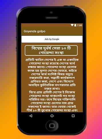 গোয়েন্দা গল্প অ্যাপটি বিশ্বের সেরা সেরা সব গোয়েন্দা আর তাদের সমাধান করা রহস্য গল্প দিয়ে সাজানো হয়েছে। গোয়েন্দা দের মাঝে আছেন ফেলুদা, ব্যোমকেশ বক্সী এবং জগৎবিখ্যাত "অবরোহ প্রনালী"র জনক শার্লক হোমস। এই অ্যাপটিতে এই তিন গোয়েন্দা কাহিনি রয়েছে।
