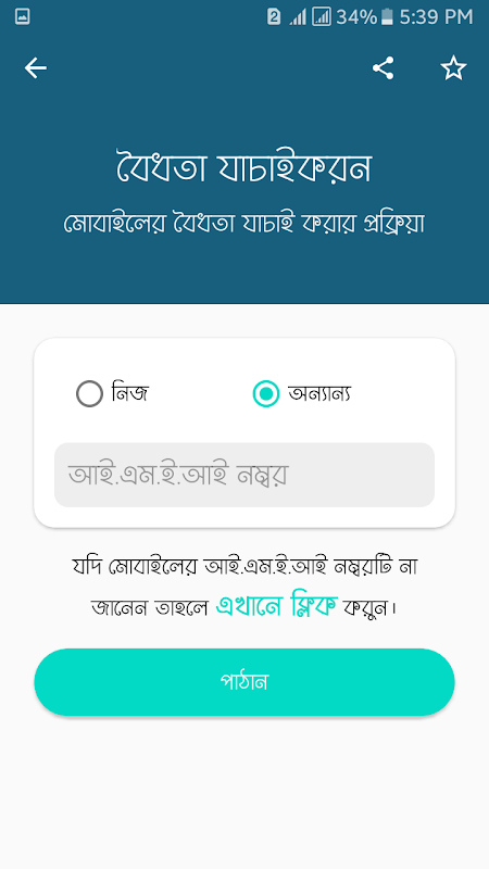 মোবাইলের বৈধতা যাচাইকারী - очень хорошее и удобное приложение, которое помогает выяснить, является ли телефон реальным или поддельным, сопоставив его с базой данных IMEI. Используя этот инструмент мобильной проверки, пользователю нужно только отправить текст на определенный номер. Текст возврата подтвердит идентичность набора. Это приложение поддерживает всех сим-операторов в BD, таких как grameenphone (gp), Banglalink, Robi, Airtel, Teletalk для отправки SMS.