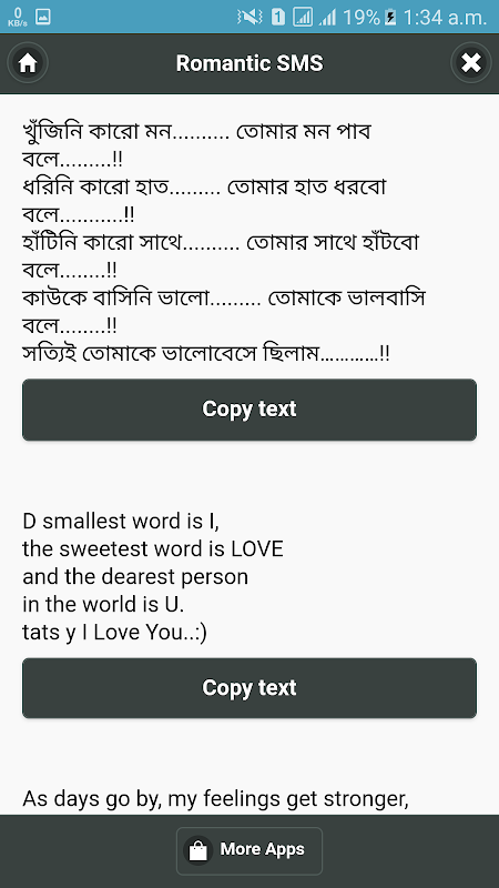 Bangla SMS বা ভালোবাসার মেসেজ অ্যাপটি অনেকটা এসএমএস বাংলা বই এর বিশাল সমাহার। আজকাল অনেকেই bangla sms পড়তে পছন্দ করেন, আবার কেউ কেউ বিভিন্ন দিবসে যেমন (বন্ধু দিবস, friends day , valentine day, ভালবাসা দিবস ইত্যাদি ) এস এম এস বাংলা বা ভালবাসার বাংলা এস এম এস প্রিয়জনকে দিয়ে থাকেন।