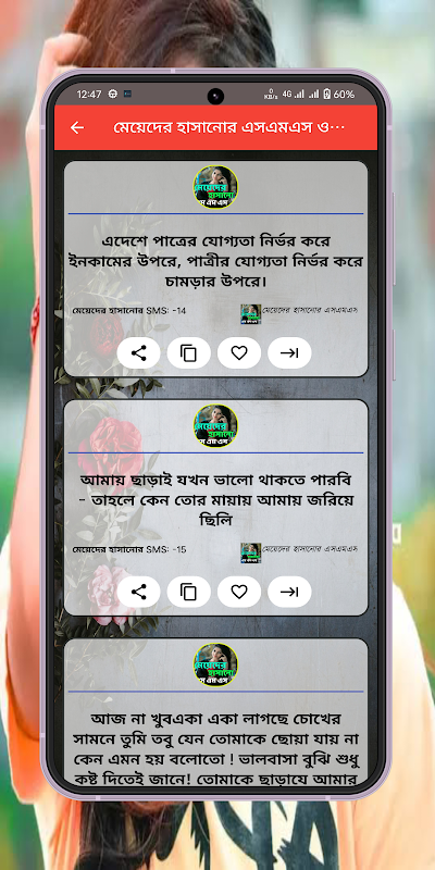 এই অ্যাপসটিতে মেয়েদের হাসানোর এসএমএস আছে তা অপনি বন্দুদের সাথে ১ কিল্কে কপি এবং শেয়ার করত ে পারবেন ।