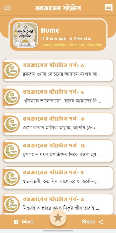 Если вы хотите, чтобы это произошло, вы можете লামিক স্ট্যাটাস খুঁজেন বন্ধুদের সাথে শেয়ার ক Очень приятно! তাদের জন্য আমাদের এই অ্যাপ । যা আপনি নিজে পড়ুন এবং অন্য সবার সাথে শেয়ার কর ুন। SMS и статус Рамадана এটিতে রয়েছে কোরআন ও হাদিসের আলোকে ইসলামিক উক্তি যা আপনি এসএমএস বা স্ট্যাটাস হিসাবে অন্ে শেয়ার করতে পারবেন অথবা ফেসবুক স্ট্যাটাস এ পোস ্ট করতে পারবেন। এইসব ইসলামিক বানী বা বিখ্যাত উক্তি গুলোকে আপন ি ইসলামিক পোষ্ট ও ক্যাপশন হিসাবেও ব্যবহার করতে পারবেন ।