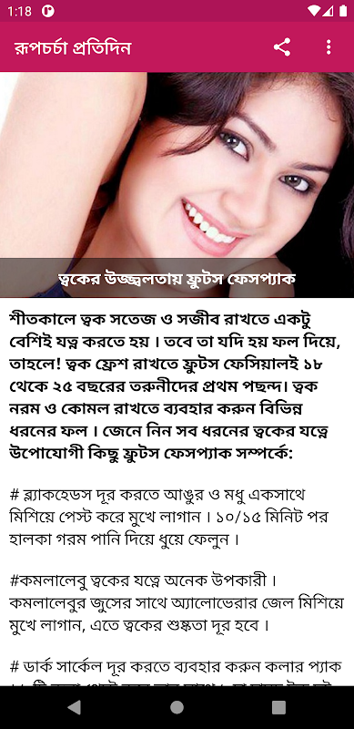 ঘরে বসে ঘরোয়া উপায়ে রূপচর্চা করতে আমাদের টিপস গুলি আশাকরি আপনাকে অনেক সহায়তা করবে। প্রতিদিন নিত্যনতুন চমৎকার সব টিপস পাবেন আমাদের "রূপচর্চা প্রতিদিন" অ্যাপ-এ। সম্পুর্ন বাংলায় এবং বিভিন্ন শ্রেণিতে ভাগ করে দারুন ভাবে সাজানো রয়েছে। আপনি খুব সহজেই আপনার কাঙ্খিত টিপস গুলি খুজে নিতে পারবেন।