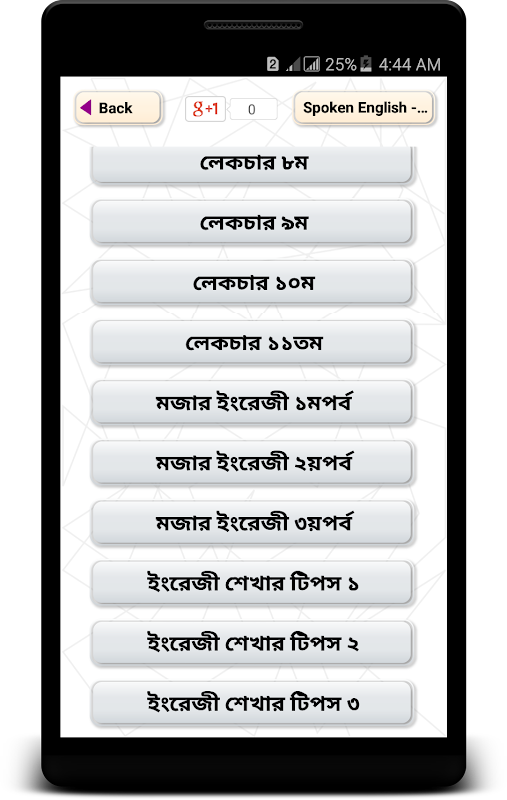 There are so many spoken english book in bengali and can get basic spoken english books free download available. But this spoken english apps is very different from other bangla spoken english. To learn english properly you have to learn english grammar in bengali. There are some equational formulas to get the grammar properly in simple and easiest way. Lots of daily use english vocabulary which will help you in daily use english vocabulary. Necessary english and bangla translation also included in this application. You can also try other vocabulary english to bangla app or books to improve your english to bangla words.