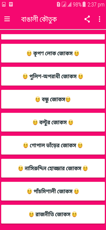 Эти приложения «бенгальские шутки» составлены из бенгальских шуток и шуток. Смех заставит ваш желудок болеть. Вам становится скучно, когда вы делаете эти вещи. В такие моменты ум в плохом настроении, в это время нужно немного развлечься, небольшая улыбка может дать вам облегчение от всей вашей усталости и скуки. А так, чтобы получить смех и веселье, читайте бенгальские смешные анекдоты и приколы. Когда у вас плохое настроение, вы будете читать смеховые анекдоты из этого приложения, и вам станет лучше. «Бенгальский розыгрыш» — приложение действительно классное.
