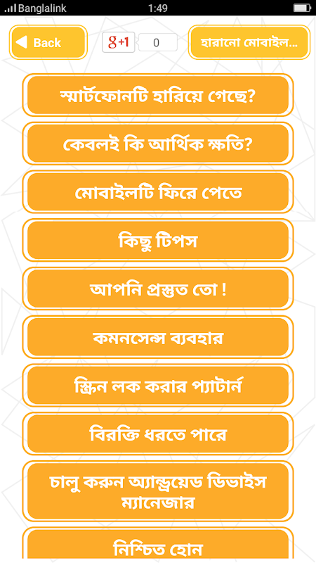 মোবাইল টিপস Mobile tips bangla - আপনার শখের অ্যান্ড্রয়েড ফোনটি হারিয়ে গেলে আপনার যা করনীয় তার সবই আমরা আমাদের এই অ্যাপসে তুলে এনেছি। এতে করে আপনি সহজেই খুঁজে বের করতে পারবেন আপনার মোবাইল ডিভাইসটি । তবে কিছু পূর্ব সতর্কতা আপনাকে অবলম্বন করতে হবে, মোবাইল লক সব সময় করে রাখবেন নইলে আপনার ফোনটি হারিয়ে বা চুরি হয়ে গেলে সাথে সাথে অন্যের কাছে চলে যাবে যদি আপনার লক করা না থাকে এখন খুব সহজেই মোবাইলের লক খোলা যায় তাই সতর্কতা মেনে চলুন। দরকারি সব ফোন নাম্বার ব্যাকাপে রাখবেন এতে করে পরবর্তীতে খুব সহজেই ফোন নাম্বার গুলো আপনি ফিরে পাবেন । বাজারে বিভিন্ন ধরণের ব্যাকাপ অ্যাপ আছে ওইগুলো থেকে একটা নামিয়ে আপনি এই কাজ করতে পারেন। গ্রামীন ফোন, রবি, এয়ারটেল, বাংলালিংক সহ সব ধরণের অপারেটররা এই ধনের মোবাইল সাভিস দিয়ে থাকে । একটা নিদিষ্ট পরিমান ফী দিয়ে এদের মোবাইল সাভিস ব্যবহার করতে পারেন। ডিভাইসে জরুরী মোবাইল কোড ইউজ করুন । এইসব জরুরী মোবাইল কোড পরবর্তীতে আপনাকে উপকার করবে। আপনি মোবাইল সার্ভিসিং এ যেমন সচেতন তেমনি এই বিসয়গুলো মেনে চলুন। হারিয়ে গেলে প্রথমে যা করণীয় তা হল - থানায় জিডি করুন আগে থেকেই জেনে রাখুন জিডি করার উপায়। প্রয়োজনে আপনি বাংলাদেশের থানা