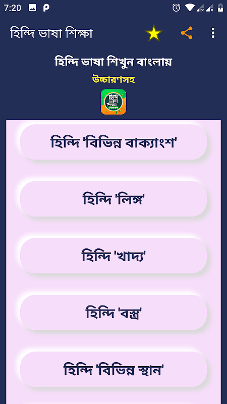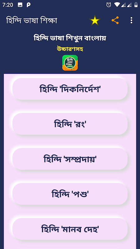 হিন্দিতে কথা বলতে চাইলে হিন্দি ভাষা শেখার বই অ্যাপটি আপনাদের বেশ কাজে দিবে, কারণ এখানে বিভিন্ন বিষয় ভিত্তিক অনেক পরিমানে বাক্য ও শব্দ সংযোজন করা হয়েছে। এখানে প্রতিটি বাক্য ও শব্দ এর হিন্দি উচ্চারণ দেয়া হয়েছে।