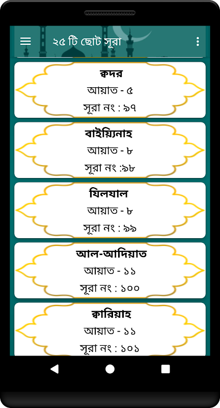 HD Quality Audio MP3 সহ আরও যা যা থাকছে এই অ্যাপ টিতে, ২৫ টি ছোট সুরা আরবী, বাংলা উচ্চারণ সহ বাংলা আর্থ, যাতে খুব সহজেই সূরাগুলি শুনতে, পড়তে ও বুঝতে পারাযায়, যারা এখনো নামাজ পড়ার জন্য সূরা শিখেননি, এই App থেকে খুবসহজেই শিখতে পারেন অথবা আপনার ঘরে যদি কোন ছোট বাচ্চা থাকে তাদেরকেও শিখাতে পারেন। In this App most useful and easy 25 small surah with benglai pronunciation, meaning and audio MP3 file for listen all surah clearly. This app for memorize all small surah easily. এই অ্যাপ টিতে আরও থাকছে, সূরা আল ফাতিহা, সূরা ফীল, সূরা আল কোরাইশ, সূরা আল মাউন, সূরা আল কাওসার, সূরা আল কাফিরুন, সূরা আন নছর, সূরা আল লাহাব, সূরা আল এখলাছ, সূরা ফালাক,সূরা আন নাস, ছোট সূরা বাংলা, সূরা হুমাইজা, সূরা আল আছর, সূরা আত তাকাসুর, সূরা আল কারিয়া, সূরা আল আদিয়াত, সূরা জালজালা, সূরা আল বাইয়েনা, সূরা আল কাদের, সূরা আল আলাক, সূরা আত তিন, সূরা আল ইনশিরাহ, সূরা আদ দোহা, সূরা আল লাইল, সূরা আস সামস, Surah Al-Fatihah, Surah Asy-Syamsa, Surah Al-Lail, Surah Ad-Duha, Surah Al-Insyirah, Surah At-Tin, Surah Al-'Alaq, Surah Al-Qadr, Surah Al-Bayyinah, Surah Az-Zalzalah, Surah Al-'Adiyat, Surah Al-Qari'ah, Surah At-Takasur, Surah Al-'Asr, Surah Al-Humazah, Surah Al-Fil, Surah Quraisy, Surah Al-Ma'un, Surah Al-Kausar, Surah Al-Kafirun, Surah An-Nasr, Surah Al-Lahab, Surah Al-Ikhlas, Surah Al-Falaq, Surah An-Nas, 25 small surah from Al Quran, Islamic app, namaz shikkha, ধন্যবাদ, Thanks.